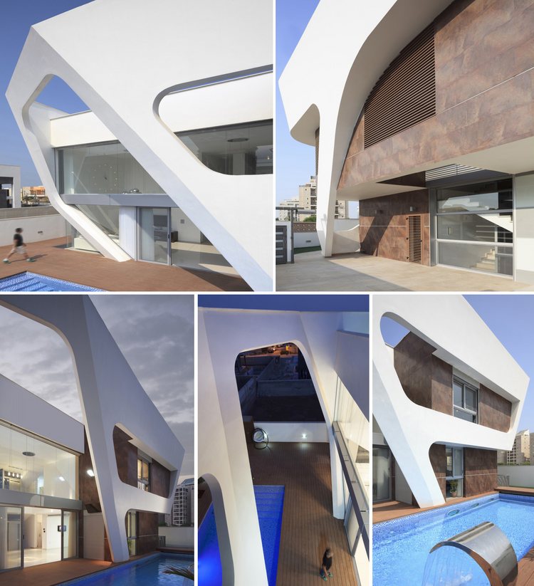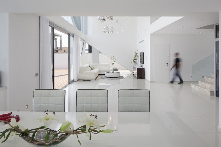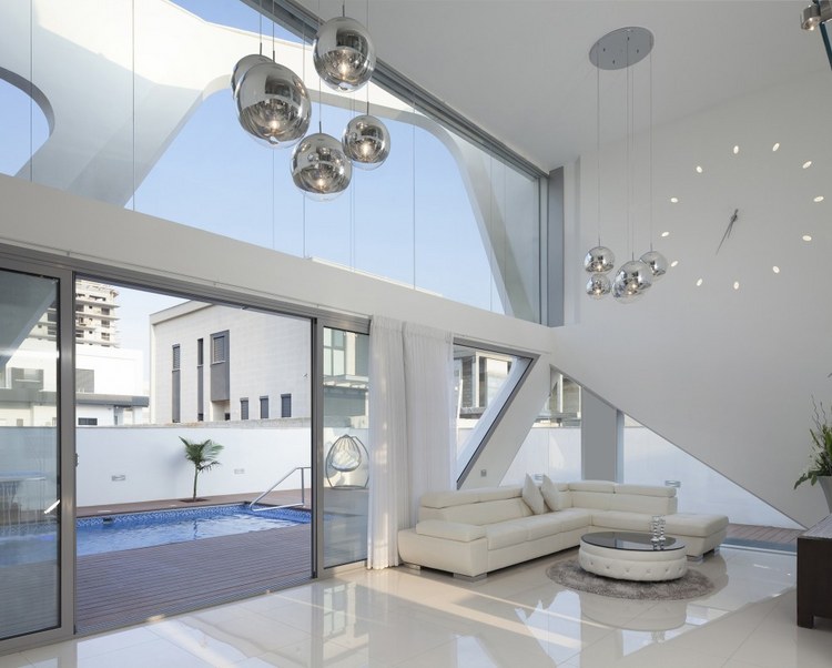 住宅運用切割手法形成了造型前衛的外立面結構。立面表層格外亮白、有趣,像蜘蛛網一樣鋪開。住宅采用的各種對比效果凸顯出優雅與奢華感。天花板高度相當高,給整個空間帶去縱深感。落地窗讓室內通透明亮(在客廳與樓上的臥室中,落地窗甚至替代了墻面),室內裝飾著漂亮的銀色球型吊燈。此外,環境更為通風,室內外也緊密地聯系起來。