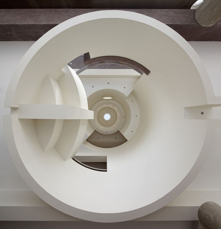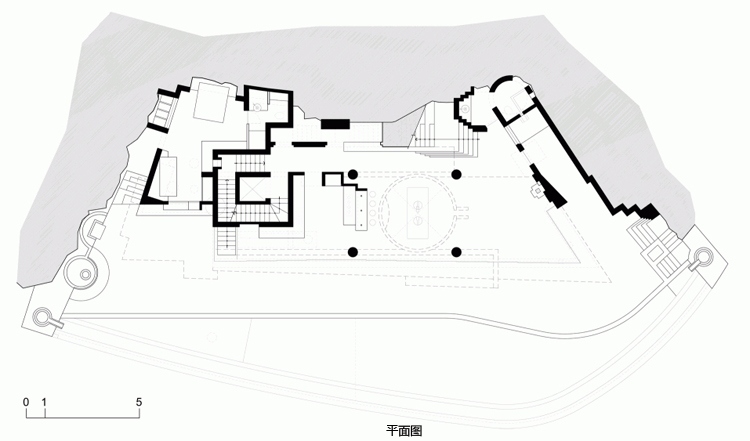公共活動區位于抬升的長約40米的游泳池露臺上,并且被設計成如同遠處小山臺地的蜿蜒曲折,后面是一扇巨大的玻璃門,人們可以在這里看到客廳、廚房等室內情況。