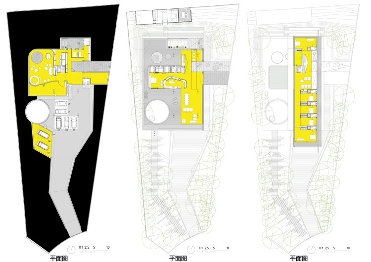 1.舒適性體驗 地下室內部映照著一定的自然光可以滿足休閑娛樂所用。趣味從停車庫開始,透過這里的后擋風玻璃窗設計可以看見游泳池;由彩色模壓混凝土鋪筑成的人行道加強了房間與室外區域的聯系; 2.居住性體驗 一層包括一個C形區域并向私人開放向空間敞開。巨大的懸臂頂棚將內外區域連接起來,家人可以在這里聽音樂、看展覽。