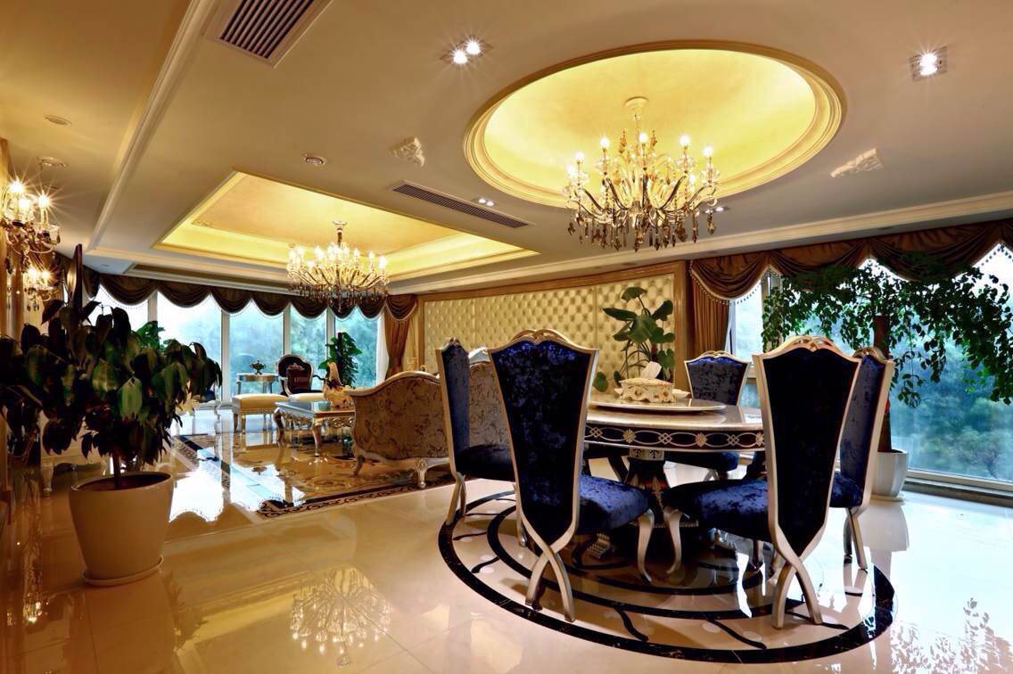 餐廳秉持典型的法式風格搭配原則,餐桌和餐椅均為米白色,表面略帶雕花,配合扶手和椅腿的弧形曲度,顯得優雅矜貴,而在白色的卷草紋窗簾、水晶吊燈、落地燈、瓶插百合花的搭配下,浪漫清新之感撲面而來.