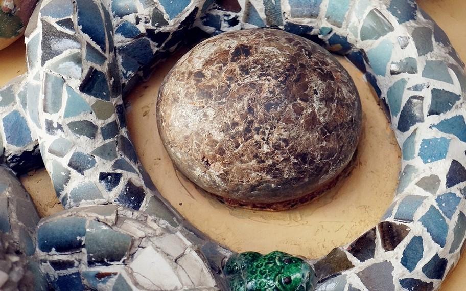 豪宅設(shè)計(jì)分享房子正門口一面墻上的裝飾,最中間棕色球形物品為一顆據(jù)今2億年前的恐龍蛋化石。